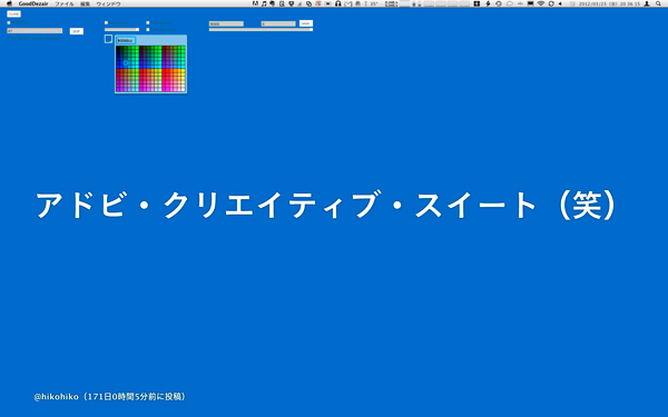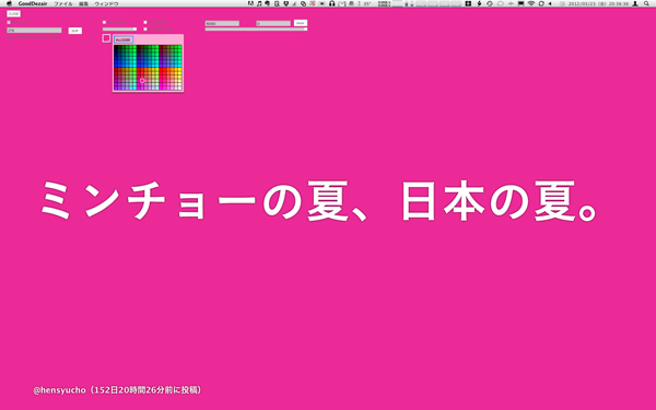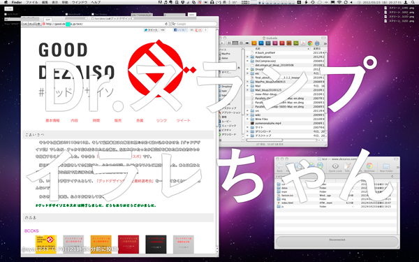 Twitter上で大きな盛り上がりを見せた、デザイン関連のダジャレコンテスト「グッドデザイソ賞」。cookedとして制作した「グッドデザイソアプリ」は、グッドデザイソ賞2011 一次選考通過作品300作品が、すべてのウィンドウの手前にダジャレがでてきてしまうデスクトップをダジャレ化するアプリケーションです。